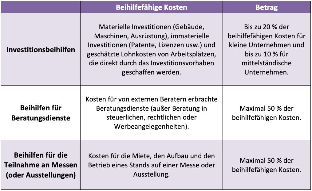 In Anbetracht der beständigen und kontinuierlichen Entwicklung des wirtschaftlichen Umfelds möchte die Regierung insbesondere die Wettbewerbsfähigkeit von KMU fördern und diese bei der Steigerung ihrer Leistungsfähigkeit unterstützen. Zu diesem Zweck bietet das neue Beihilfesystem zusätzliche Möglichkeiten. Nachfolgend finden Sie einen kurzen Überblick über die Beihilfen für KMU. Zunächst sind die Beihilfen des alten Systems zu nennen, die beibehalten und angepasst wurden: