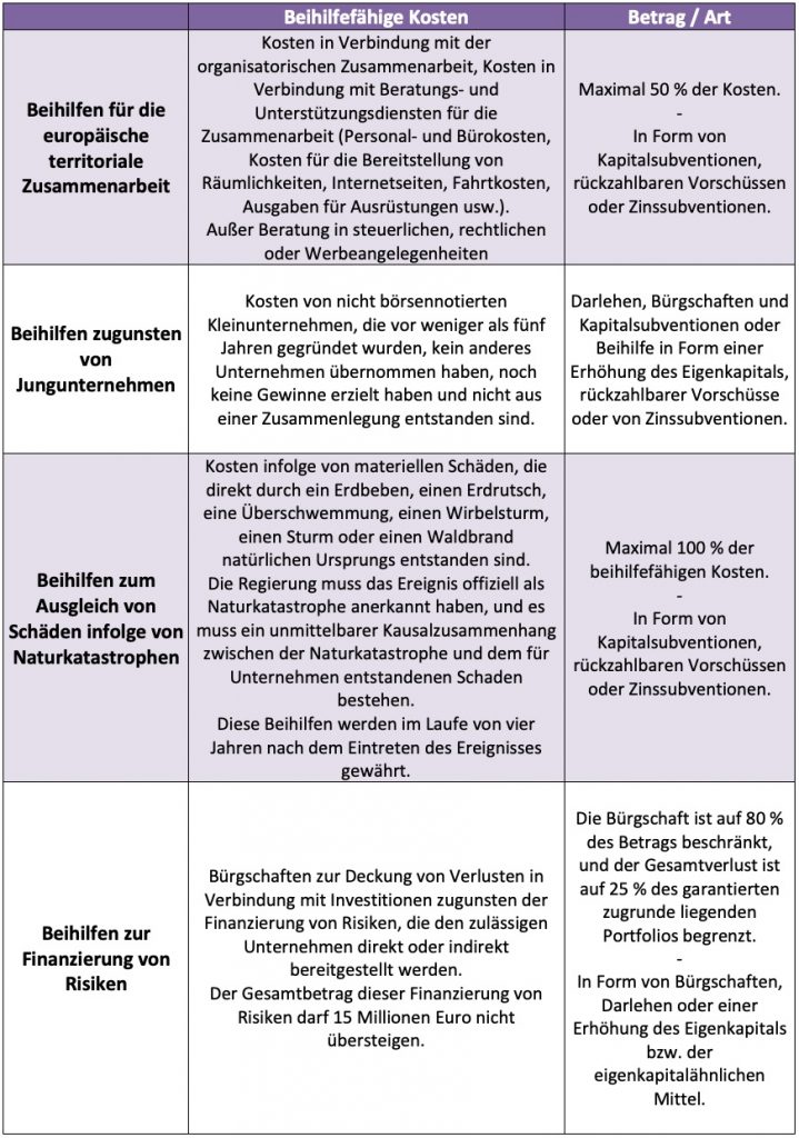 Künftig kann der Staat auf verschiedene Arten Hilfestellung leisten. Je nach beantragter Beihilfe kann der Unternehmer folgende Förderungen erhalten: eine Kapitalsubvention, einen rückzahlbaren Vorschuss, eine Zinssubvention, eine Bürgschaft, ein Darlehen oder eine Erhöhung des Eigenkapitals bzw. der eigenkapitalähnlichen Mittel.