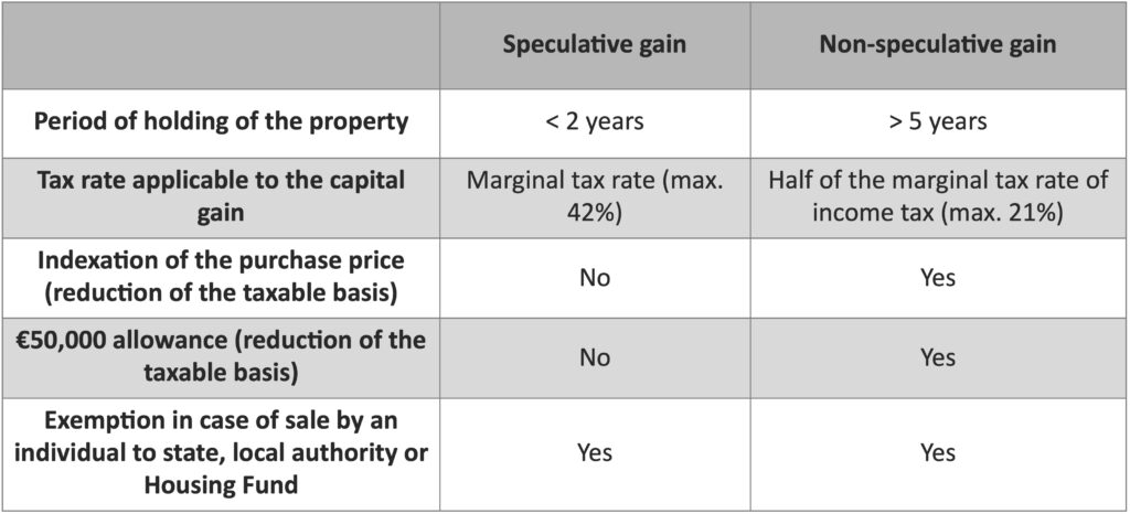 Sellers in a non-speculative sale can claim an indexation allowance created to mitigate the impact of inflation. A coefficient is applied to the purchase price, depending on when the property was acquired. In these cases, sellers also benefit from a €50,000 allowance (double in the case of joint taxation) reducing the taxable basis, the capital gain.