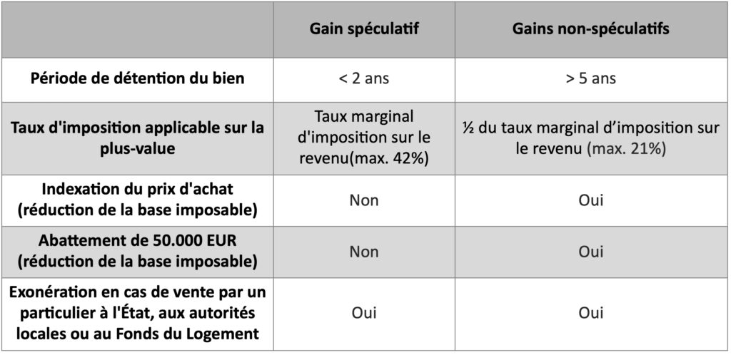 Il existe des exonérations de l’impôt sur les plus-values dans le cas de ventes par des particuliers de biens immobiliers à l’État, aux collectivités locales et au Fonds du Logement du Luxembourg, tant que le bien n’est pas soumis à un droit de préemption.